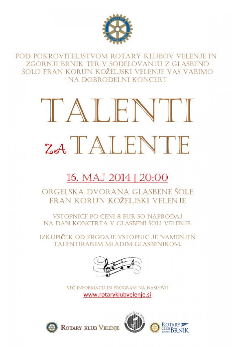 Z veseljem vas obveščamo, da bodo na dobrodelnem koncertu TALENTI ZA TALENTE nastopili mladi in talentirani glasbeniki pod pokroviteljstvom glasbene šole Fran Korun Koželjski Velenje, Rotary kluba Velenje in Rotary kluba Zgornji Brnik.