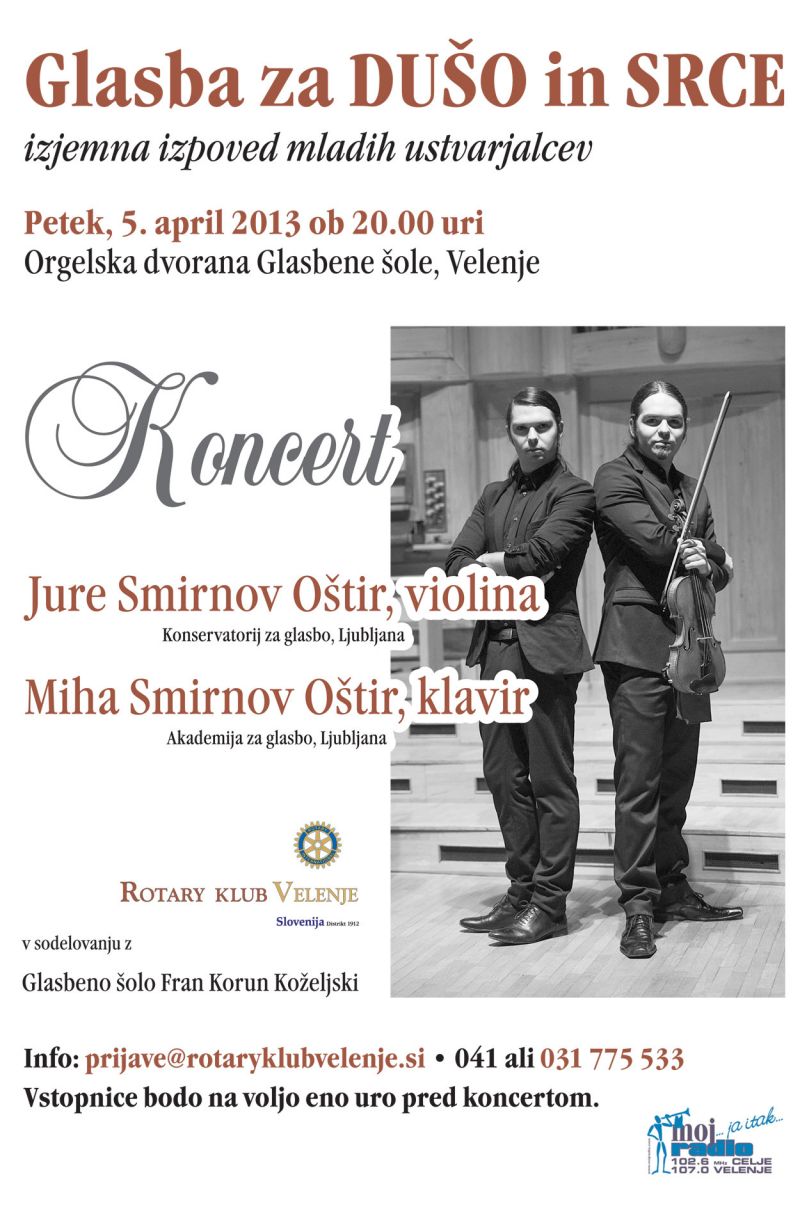 Rotary klub Velenje je v sodelovanju z Glasbeno šolo Fran Korun Koželjski v orgelski dvorani Glasbene šole v Velenju v petek, 05.04.2013 pripravil izjemen glasbeni dogodek. Mlada ustvarjalca Jure in Miha Smirnov Oštir sta nam podala svojo izjemno izpoved na koncertu za dušo in srce. Zbrana sredstva smo namenili Varni hiši v Velenju in podpori za nadarjena študenta glasbe.
