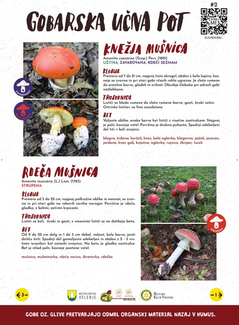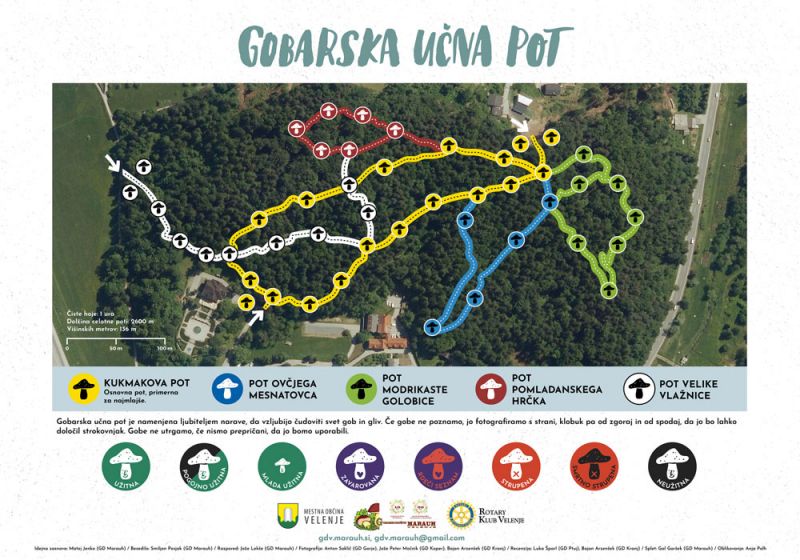 Gobarsko društvo Marauh je v sodelovanju z Mestno občino Velenje in Rotary kubom Velenje v Velenju na Trim stezi postavilo gobarsko učno pot. Na poti je na 40 tablah podrobno predstavljenih 80 vrst gob. Zanimivost te poti je tudi ta, da lahko s pomočjo QR kode in interneta obiskovalci pridejo do prevodov opisov gob v več deset svetovnih jezikov (zelena mušnica je opisana kar v 63 jezikih).