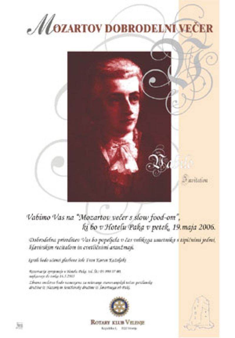 V Rotary klubu Velenje pripravljamo dobrodelno prireditev s tipičnimi jedmi, klavirskim recitalom, cvetličnimi aranžmaji in natakarji iz časa velikega umetnika Wolfganga Amadeusu Mozarta. Prireditev, ki je organizirana ob prvi obletnici ustanovitvenega charterja našega kluba, bo potekala 19. maja 2006 v Hotelu Paka v Velenju. Preberite več o dogodku tukaj .