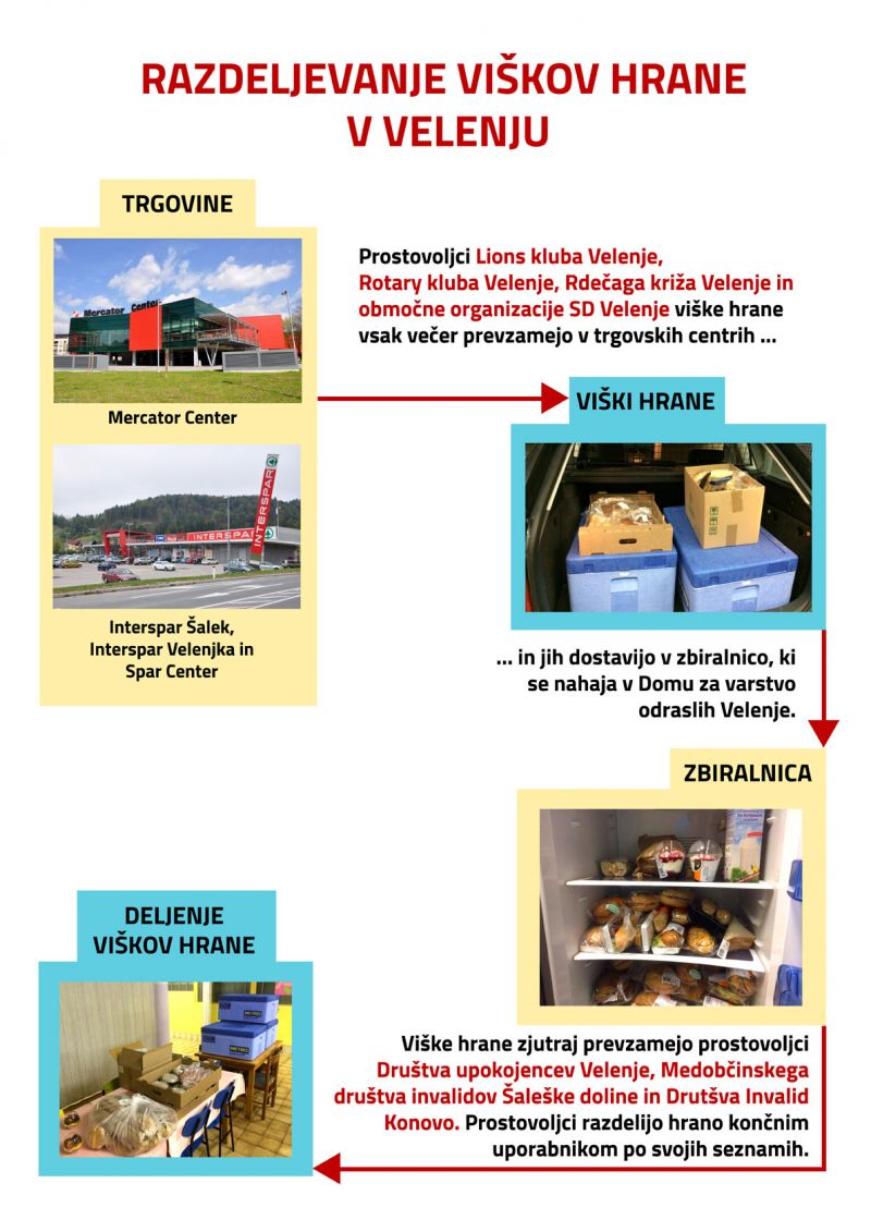 Krovno projekt koordinira Zveza Lions klubov Slovenije, v Velenju pa prevzem hrane organiziramo prostovoljci in člani Lions kluba, Rotary kluba Velenje, Območnega združenja Rdečega križa Velenje ter Strokovnega sveta za socialna vprašanja pri Območni organizaciji Socialnih demokratov Velenje, ki vsak večer viške hrane dostavijo v zbiralnico, kjer se primerno shrani do jutra. Zjutraj hrano izmenično prevzamejo prostovoljci Društva upokojencev Velenje, Društva Invalid Konovo in Medobčinskega društva Šaleške doline. Le-ti hrano na osnovi urejenih seznamov Centra za socialno delo Velenje razdelijo socialno ogroženim posameznikom in družinam.
